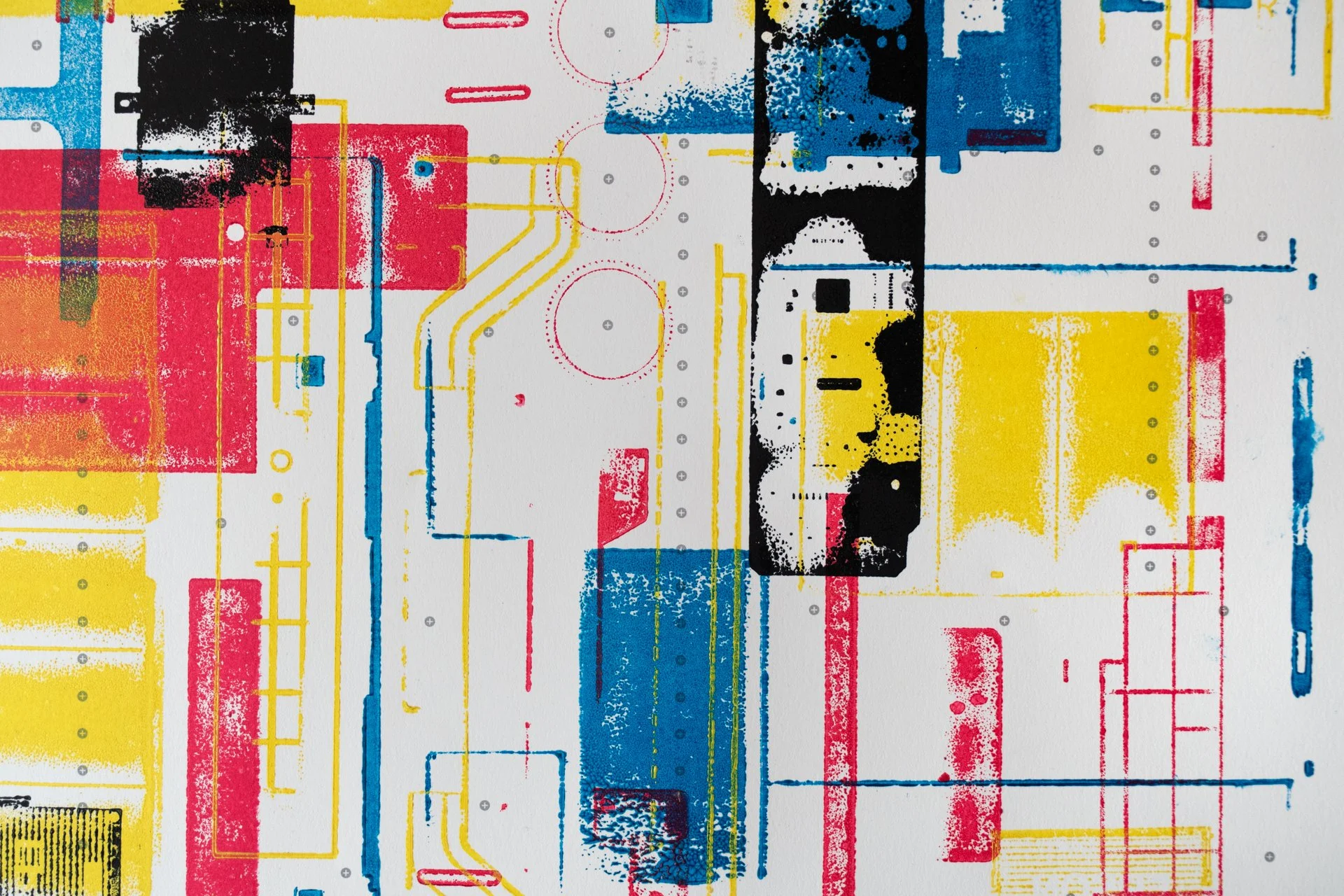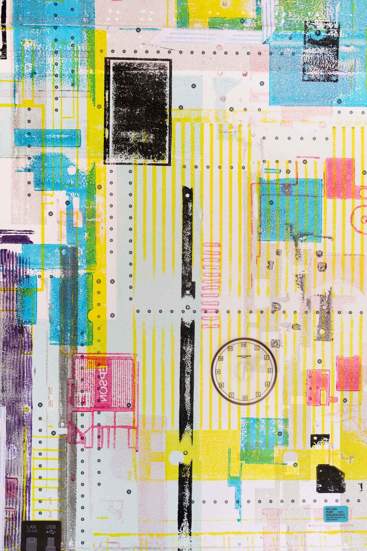 Disassembled inkjet printer parts, relief printed on paper. 30 in x 60 in.Edition of 5.